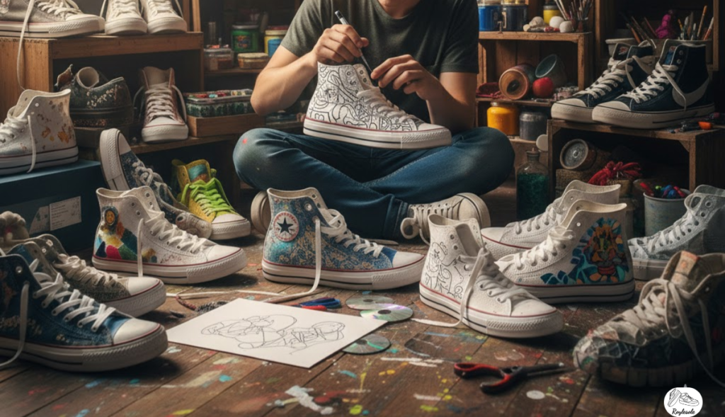 You will need paint, brushes, and cleaning supplies for preparation. High-quality markers, stencils, and masking tape help achieve precise lines. Sneaker blanks or old shoes make excellent starting points for design. Protective gloves and aprons keep your hands and clothes safe. Always organize your workspace to avoid mistakes and work efficiently.